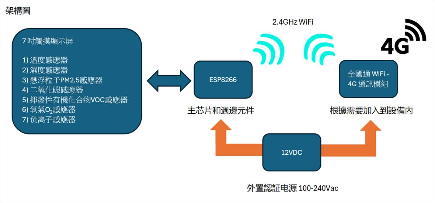A. 物联网空气检测机使用主芯片 ESP8266,提供 2.4GHz WiFi (兼容 WiFi6 路由器) 连网功能及控制和读取外围传感器数据。检测数值采用国际用通的计量单位,经采集和边缘计算的数据会显示在 7 吋的 LCD 触模屏上和上传到云端 MQTT 服务器。连接互联网方式可以是通过 WiFi 或 中国内地,中国香港或中国澳门的电讯网络 (兼容 4G 和 5G)。