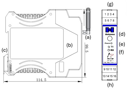 (a) 偶极 天线** (b) 主体 ME22.5 外壳*** (c) 卡扣轨道 (d) SMA 天线接口 (e) 电源指示 – 黄色 (f) 状态灯 – RX (绿色) / TX (红色) (g) 1 Vcc 2 GND 3 Vcc 4 GND 5 NA 6 NA 7 NA 8 NA (h) 9 CH1 RS485A 10 CH1 RS485B 11 CH2 RS485B 12 CH2 RS485A 13 CH1 RS485A 14 CH1 RS485B 15 CH2 RS485B 16 CH2 RS485A 工作模式